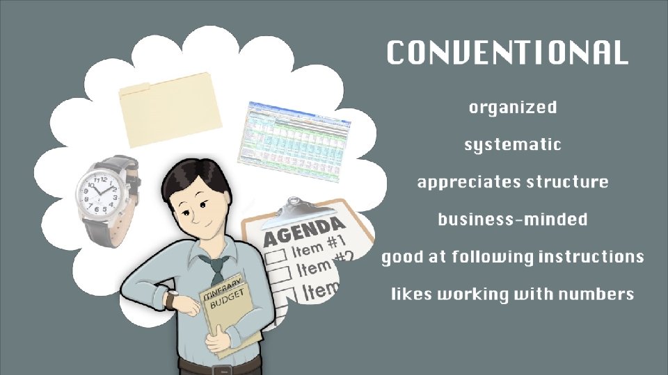 Persona 6: Judy (Conventional) Judy is a 15 year old process-oriented student with a strong attention to detail. She responds best in structured environments where clear directions are provided for her to follow. Her favorite subjects are business math, data processing, and English. Judy volunteers at the school’s food pantry and enjoys organizing and tracking donations. She is in the Accounting Club, head of the Yearbook Committee, and is a library volunteer. She is also on the Prom Planning Committee.