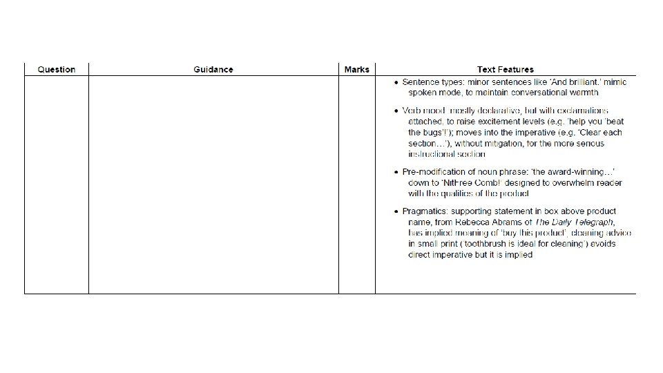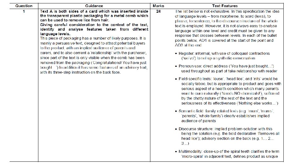Nitty Gritty Nit. Free Comb This text has been taken from a previous AS ‘Exploring Language’ exam paper. At AS level, students are not required to write a two-part response (lexis and grammar). However, it is useful to look at the mark scheme to see which language features the exam board consider to be important. Task: Read through the mark scheme and decide which points are lexical and which are grammatical.
