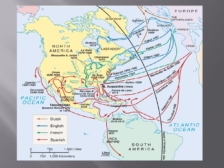 1519 – 1522 Ferdinand Magellan first to sail around the world 1492 – 1504 Christopher Columbus explored Caribbean Islands 1610 – 1611 Henry Hudson explored the Hudson Strait and Hudson Bay 1524 Giovanni da Verrazano explored the east coast of North America including New York Harbor 1540 – 1542 Francisco Coronado explored southwestern North America 1498 Vasco da Gama reaches India 1400 1500 1600 1539 – 1543 Hernando de Soto led expedition to the Mississippi River 1497 – 1501 John Cabot rediscovered Newfoundland (east coast of America) 1542 – 1543 Juan Cabrillo explored the west coast of North America 1534 – 1542 Jacques Cartier explored the St. Lawrence River 1508 – 1509, 1513 Ponce de Leon explored Puerto Rico and Florida Spain Portugal England Netherlands 1673 Jacques Marquette/ Louis Joliet explored the Mississippi River 1603 – 1615 Samuel de Champlain explored the St. Lawrence River and Founded Quebec Canada France 1609 Henry Hudson explored the Hudson River 1666 – 1682 Robert de La Salle explored the Great Lakes and founded Louisiana after reaching the mouth of the Mississippi River