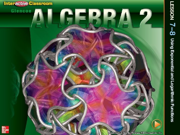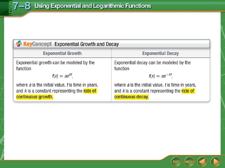 Exponential Decay In 0. 5 = In e– 2. 6 k In 0. 5 = – 2. 6 k Property of Equality for Logarithmic Functions Inverse Property of Exponents and Logarithms Divide each side by – 2. 6. 0. 2666 ≈ k Use a calculator. Answer: The value of k of Sodium-22 is 0. 2666. Thus, the equation for the decay of Sodium-22 is y = ae– 0. 2666 t, where t is given in years.