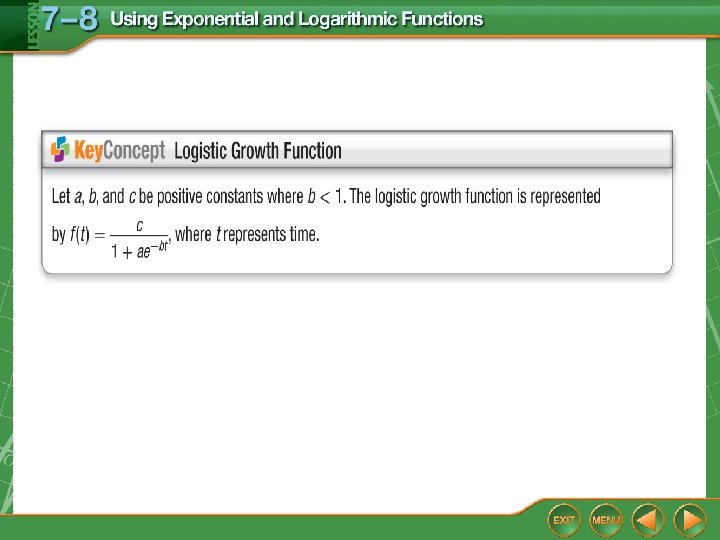 Logistic Growth D. A city’s population in millions is modeled by , where t is the number of years since 2000. According to the function, when will the city’s population reach 1 million? Answer: The graph indicates the population will reach 1 million people at t ≈ 3. Replacing f (t) with 1 and solving for t in the equation yields t = 2. 78 years. So, the population of the city will reach 1 million people by 2003.