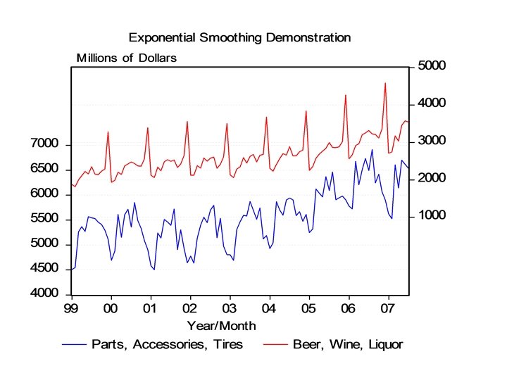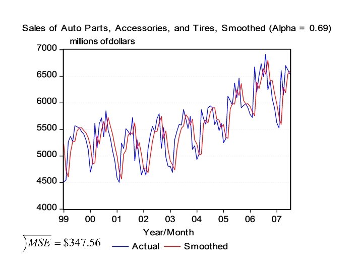 Auto Parts, Accessories, and Tires (Alpha =. 69) Year 2006 2006 2007 2007 Month 7 8 9 10 11 12 1 2 3 4 5 6 7 Actual 6493 6914 6245 6419 6072 5900 5628 5526 6608 6144 6702 6619 6538 Smoothed 6642. 08 6539. 21 6797. 82 6416. 37 6418. 19 6179. 32 5986. 59 5739. 16 5592. 08 6293. 06 6190. 21 6543. 34 6595. 55
