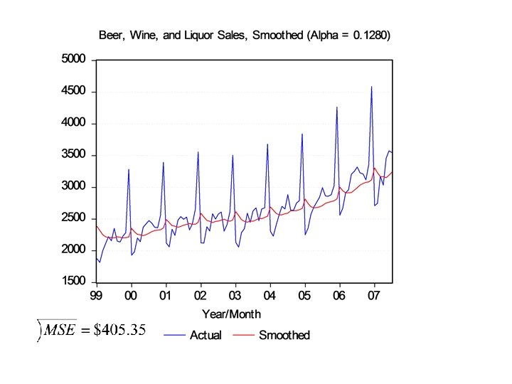 Beer, Wine, and Liquor (Alpha =. 1280) Year 2006 2006 2007 2007 Month 7 8 9 10 11 12 1 2 3 4 5 6 7 Actual 3322 3228 3212 3120 3359 4588 2710 2748 3176 3037 3459 3578 3547 Smoothed 2994. 10 3036. 07 3060. 64 3080. 01 3085. 13 3120. 19 3308. 08 3231. 52 3169. 63 3170. 44 3153. 36 3192. 48 3241. 83