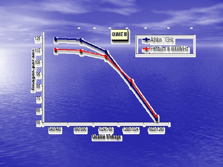 • Pas de surprise, si dans les basses résolutions, la carte • se révèle équivalente à la GF 256 DDR, on voit tout l'intérêt de cette carte dès que cette résolution augmente. En 1600 x 1200, la GF 2 GTS est alors 2 fois plus performances que sa soeur aînée et 1, 5 que la voodoo 5 5500. Cette carte en performances est vraiment époustouflante. On se trouve bien devant la meilleure carte du marché actuel. Quant à savoir si cette carte est influé par la fréquence du processeur ou le type de processeur utilisé, on peut répondre que dans les hautes résolutions la limitation n'est du au processeur amis à la carte vidéo. Quant aux basses résolutions, plus votre processeur sera rapide, plus la GF 2 GTS suivra et affichera une cadence d'images élevée.