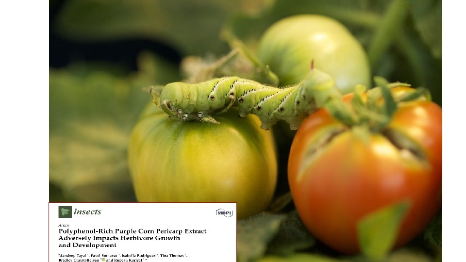 References: • Gupta. S, Dikshit. A. Biopesticides: an ecofriendly approach for pest control. JBiopest; 2010. . • Li. Q, Somavat. P, Singh. V, Chatham. L, Mejia. EGD. A comparative study of anthocyanin distribution in purple and blue corn coproducts from three conventional fractionation processes. Food Chem. 2017; 231: 332– 339. doi: 10. 1016/j. foodchem. 2017. 03. 146. • Tayal. M, Somavat. P, Rodriguez. I, Thomas. T, Christoffersen. B, Kariyat. R. Polyphenolrich purple corn pericarp extract adversely impacts herbivore growth and development. Insects. 2020; 11(2): 98. doi: 10. 3390/insects 11020098