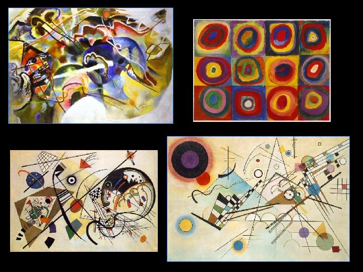 Kandinsky • Founder of the “Blaue Reiter” – Blue Rider • Sought vivid expression but not the hostility of Die Brucke group. • Kandinsky and his followers were more spiritually inclined than the Die Brucke group (and had close ties with a new sect of religious philosophy, known as theosophy). • They believed in the connection between visual art and music; the spiritual and symbolic associations of colour; and a spontaneous, intuitive approach to painting. • Eventually Kandinsky completely abandoned the necessity of using subject matter that referenced the natural world. He was the first artist to create completely non-representational paintings.