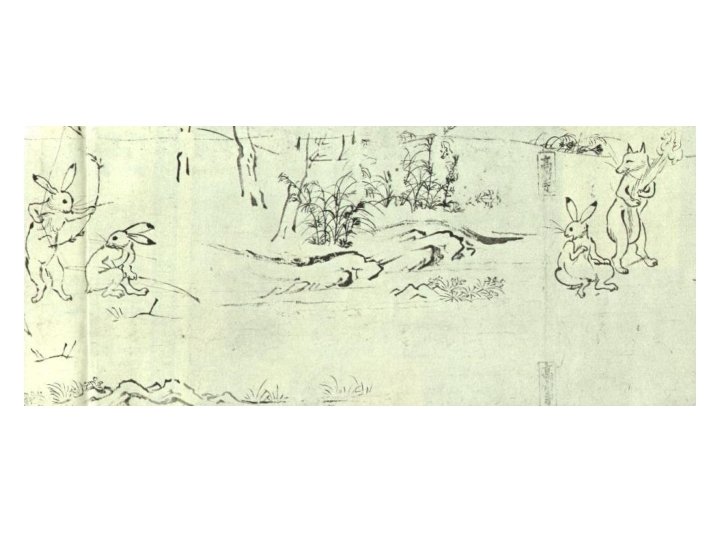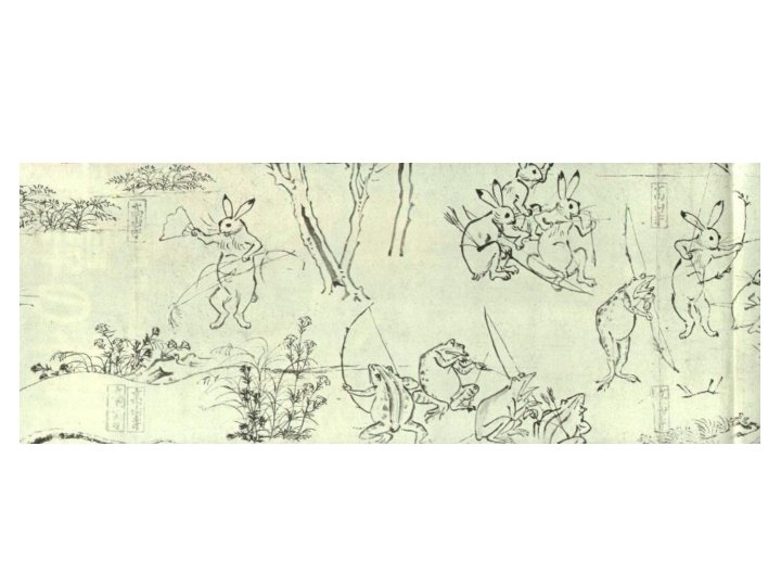 • Choju Giga: This has been considered the first Manga (cartoon) in Japan’s art history, supposedly painted by Toba Sojo. • The subject is of frolicking animals engaging in human like behavior. • Only the first chapter, Ko, is thought to be Sojo’s. It is believed that different artists painted other parts of this handscroll at different times.