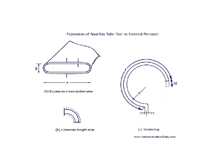 WORKING AS THE FLUID PRESSURE ENTERS THE BOURDON TUBE, IT TRIES TO BE REFORMED AND BECAUSE OF A FREE TIP AVAILABLE, THIS ACTION CAUSES THE TIP TO TRAVEL IN FREE SPACE AND THE TUBE UNWINDS. THE SIMULTANEOUS ACTIONS OF BENDING AND TENSION DUE TO THE INTERNAL PRESSURE MAKE A NON-LINEAR MOVEMENT OF THE FREE TIP. THIS TRAVEL IS SUITABLE GUIDED AND AMPLIFIED FOR THE MEASUREMENT OF THE INTERNAL PRESSURE. BUT THE MAIN REQUIREMENT OF THE DEVICE IS THAT WHENEVER THE SAME PRESSURE IS APPLIED, THE MOVEMENT OF THE TIP SHOULD BE THE SAME AND ON WITHDRAWAL OF THE PRESSURE THE TIP SHOULD RETURN TO THE INITIAL POINT.