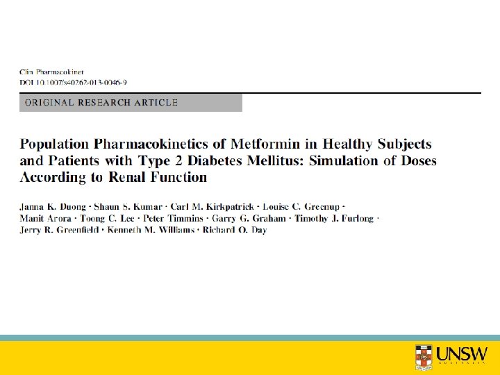 Pharmacokinetics (PK) of metformin • Hydrophillic base, cationic (>99. 9%) @ p. H 7. 4 • Not metabolised, eliminated unchanged, • Renal clearance (CLR) ≈ 4 x creatinine clearance (CLCR) • Bioavailability (F): 25 – 75 % with average of 55% • Half-life (t 1/2): 5 - 6 hours (longer terminal half-life) • Volume of distribution (VD/F): 600 -800 L Graham et al, Clinical Pharmacokinetics 2011; 50(2): 1 -18
