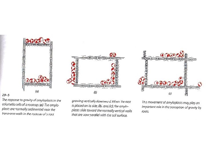 More Gravitropism • The perception of gravity is correlated with sedimentation of amyloplasts (starch containing plastids) within certain cells of the shoot and root such cells are found near the vascular bundles in shoots and in the root cap of roots, particularly the central column of the root cap • Amyloplasts are sedimented to the transverse walls (perpendicular to root surface) in the root cells - if the root is placed in a horizontal position, these amyloplasts slide downward and come to rest on what were once vertically oriented walls - within hours the root curves downward through growth of upper cells and the amyloplasts return to their previous position