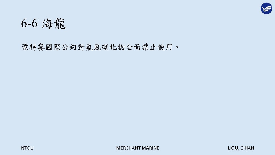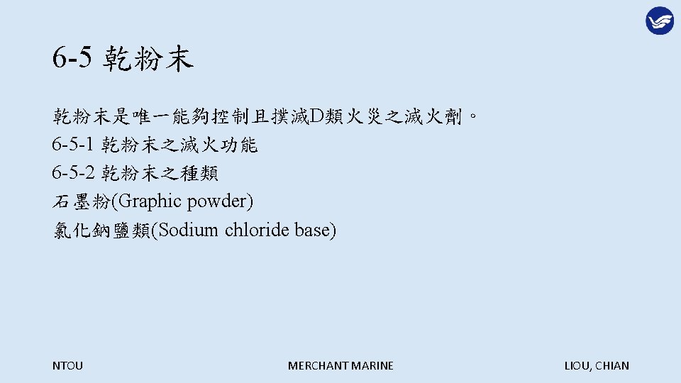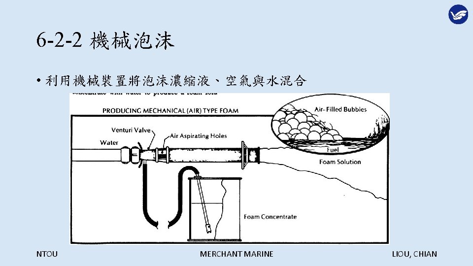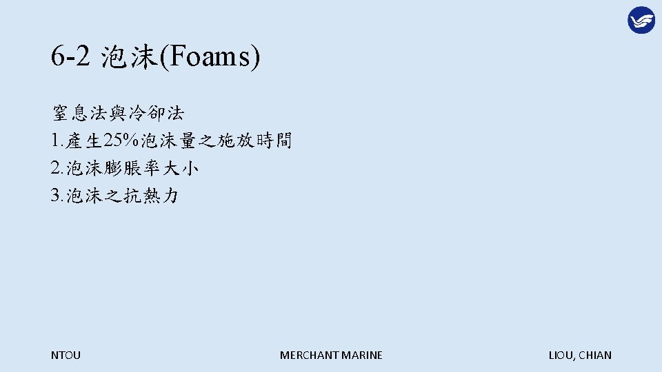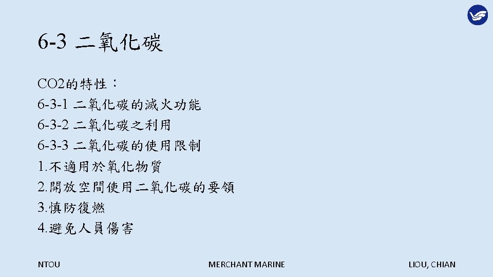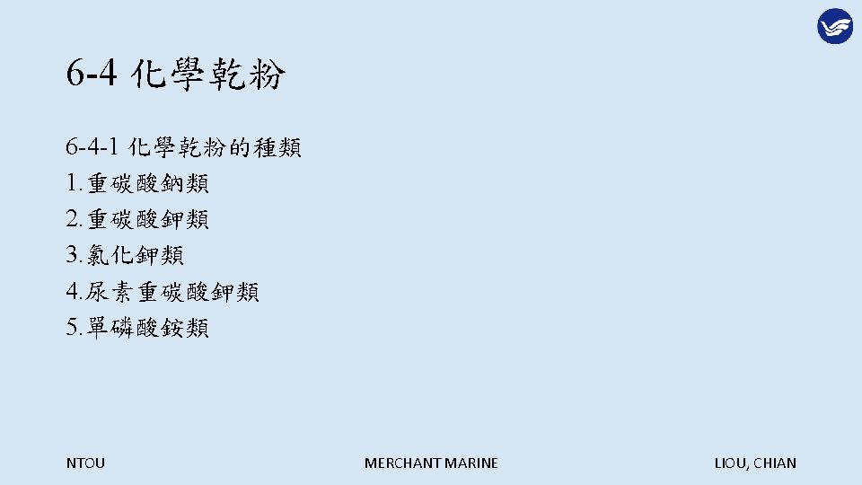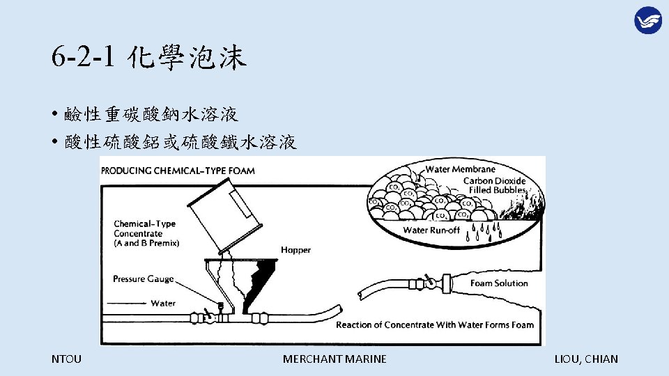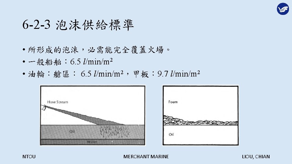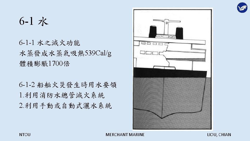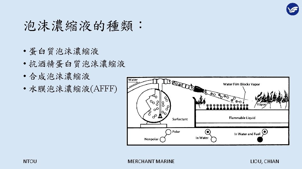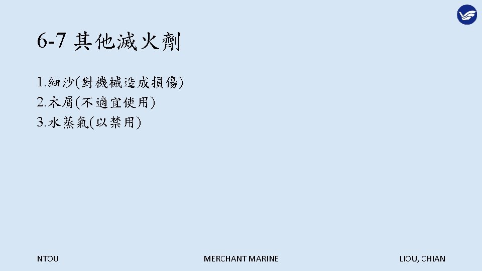 Extinguish Agents NTOU MERCHANT MARINE LIOU CHIAN NTOU Slides: 29 Download presentation 第六章 滅火劑 Extinguish Agents NTOU MERCHANT MARINE LIOU, CHIAN 滅火的方法: NTOU MERCHANT MARINE LIOU, CHIAN 冷卻法: NTOU MERCHANT MARINE LIOU, CHIAN 窒息法: NTOU MERCHANT MARINE LIOU, CHIAN 稀釋氧氣法: NTOU MERCHANT MARINE LIOU, CHIAN 阻斷鍊鎖反應法: NTOU MERCHANT MARINE LIOU, CHIAN 6 -1 -3 船舶滅火之噴水型態 1. 水柱(Straight streams) 2. 高速水霧(High velocity fog streams) 3. 低速水霧(Low velocity fog streams) NTOU MERCHANT MARINE LIOU, CHIAN 利用水柱彈跳天花板越過障礙物滅火 NTOU MERCHANT MARINE LIOU, CHIAN 水柱與水霧的優缺點比較: NTOU MERCHANT MARINE LIOU, CHIAN 以水霧仰角 20 -30度阻擋頭部上方熱浪 NTOU MERCHANT MARINE LIOU, CHIAN 以高速水霧驅動煙與熱向出口方向移動 NTOU MERCHANT MARINE LIOU, CHIAN 煙與熱浪無出口移動反撲滅火人員 NTOU MERCHANT MARINE LIOU, CHIAN 核可之船用低速噴霧桿 NTOU MERCHANT MARINE LIOU, CHIAN 多功能噴嘴(Combination nozzle) NTOU MERCHANT MARINE LIOU, CHIAN 6 -1 -4 其他種類滅火用水 1. 深透水(Wet water) 2. 厚黏水(Thick water) 3. 滑流水(Rapid or slippery water) NTOU MERCHANT MARINE LIOU, CHIAN NTOU MERCHANT MARINE LIOU, CHIAN