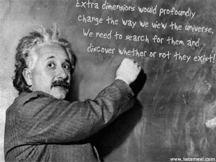 Kaluza-Klein tower of particles E 2 = (pxc)2 + (pyc)2 + (pzc)2 + (pextrac)2 + (mc 2)2 pextra is quantized = n/R Small radius gives well separated Kaluza-Klein particles In 4 dimensions, looks like a mass! Tower of massive particles Small radius Large radius gives finely separated Kaluza. Klein particles