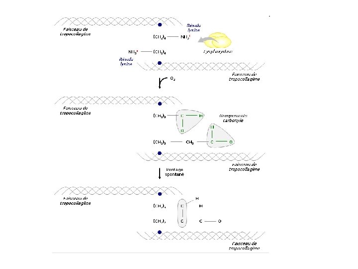 5. Secretion of procollagen molecules by exocytosis into the extracellular space. 6. Cleavage of registration peptides is catalysed by procollagen peptidases. The resulting molecule is called tropocollagen. 7. Oxidation – deamination of the hydroxylysine, the removal of (NH 2) group has a net oxidative effect and the formation of covalent crosslinks. Reaction is catalyzed by lysine oxidase (or catalase). 8. Self-assembly or polymerization of tropocollagen molecules form collagen fibrils. Cross-linkage between adjacent tropocollagen molecules stabilizes the fibrils.