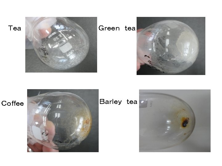 The second experiment ①We use coffee, tea , barley tea(non caffeine) and tea. We measure 30 g of them and 500 g of water. Then we heat water. ②Before boiling, we put them in the beaker. We left it for 10 minutes. 30g 500g
