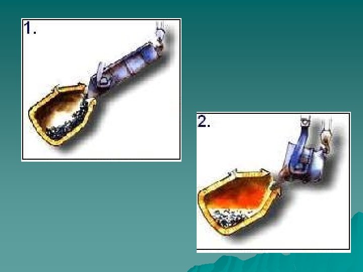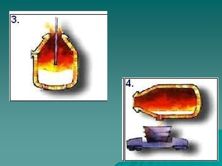 Pig Iron to Steel Using Basic Oxygen Furnace Pear-shaped furnace, lined with refractory bricks, that refines molten iron from the blast furnace and scrap into steel u Scrap is dumped into the furnace vessel u Followed by the hot metal from the blast furnace. u A high-pressure stream of oxygen is blown into it to cause chemical reactions that separate impurities as fumes or slag u Once refined, the liquid steel and slag are poured into separate containers u