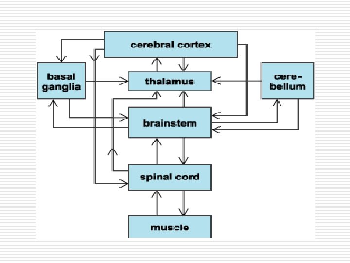 Motor Functions of the Basal Ganglia o The initiation and planning of movements o Adjusting speed and magnitude of movement o Automatically implementation of learned motor programs (walking, cycling, etc. ) o Implementation of consecutive or simultaneous movements o Adjustment of muscle tone o Truncal stability