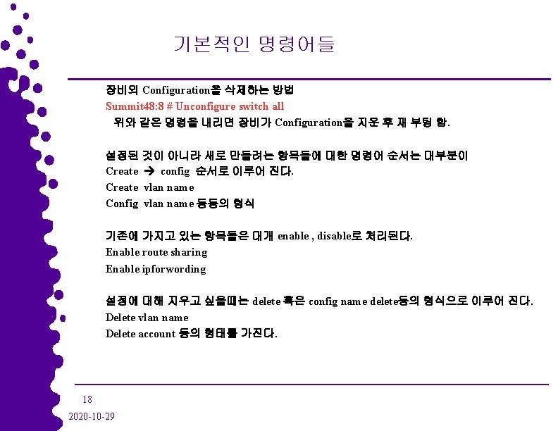 기본적인 명령어들 Configuration을 secondary에 저장한 후 다음 부팅부터 secondary에 있는 Configuraton을 사용 Summit 48: 2 # save configuration secondary Summit 48: 3 # use configuration secondary Upgrage 후 Black. Diamond에 장착되어 있는 두개의 MSM모듈을 동기화 시킨다. Black. Diamond에서 A Slot에 있는 모든 image와 configuration을 B Slot에 복사 Black. Diamond: 1 # synchronize 20 2020 -10 -29