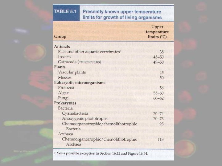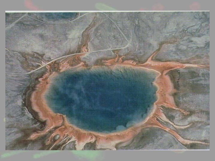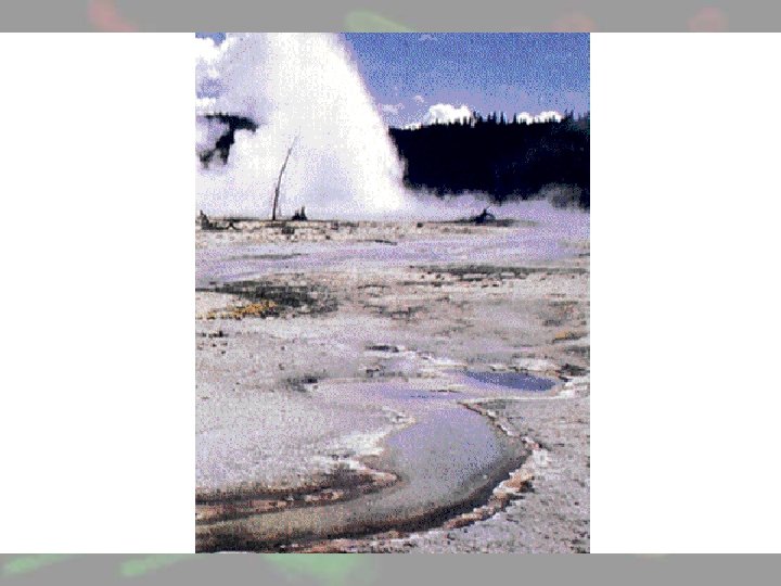 Water can pick up a lot of minerals from the hot rocks and have various p. H’s. Above 700 C there is very little Oxygen. The nutrients support a range of chemoorganotrophic and chemolithotrophic bacteria. As water flows away from the spring it cools down and you get a temperature gradient. This supports a range of bacteria including cyanobacteria below 740 C. As the temperature cools further, eukaryotic organisms can grow like thermoacidophilic alga Cyanidium Caldarium temp max 560 C.