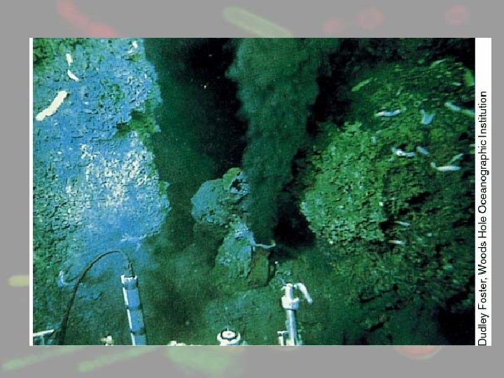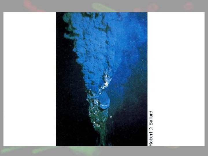 Hydrothermal fluid is emitted at 270 -3800 C, could theoretically have bacteria there. At 2, 600 m water boils at 4500 C. Hyperthermophiles are known to live around the plume coming from the chimney formed from the ppt minerals. The walls of the chimney are colonised by Methanopyrus oxidising H 2. Pyrolobus has been isolated from the plume growing at 1130 C, but may be able to grow at higher temps. Vent chimneys are colonised by the 6 cm metazoan worm Alvinella or Pompeii worm.