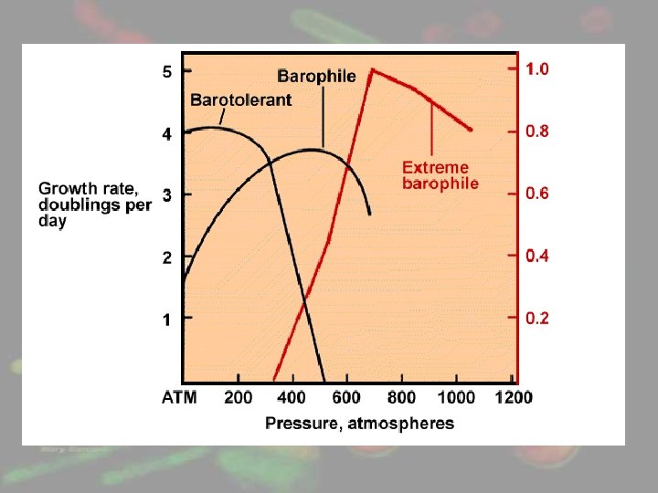 4, 000 m to 6, 000 m are barophilic. Grow optimally at 400 atm, still grow at 1 atm. From deeper waters get extreme (obligate) barophiles, optimally at 700 -800 atm. Not killed at 1 atm, but very heat sensitive. Inc pressure decreases binding capacity of enzymes, so enzymes are folded in such a way as to minimise this. The membranes have an increase in the amount of unsaturated fatty acids in their membranes to keep the membrane fluid. They grow slowly as chemical reactions are slowed down. The have special high pressure porins expressed at high pressures. This and a few other genes are specifically expressed at high pressures