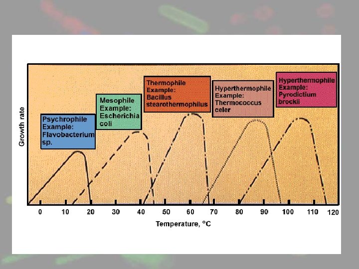 Growth at cold temperatures. Psychrophile opt growth below 150 C and max below 200 C, grows at 00 C. Psychrotolerant grows at 00 C but opt 20 -400 C. Psychrophiles found in any permanently cold environment, can be rapidly killed by room temp. Best known are algae that grow in the bottom of sea ice in polar regions. Growing in summer months on the bottom of ice ~ 2 m thick. In summer months also get alga growing under the surface of snowfields and glaciers giving it a red or green colour.