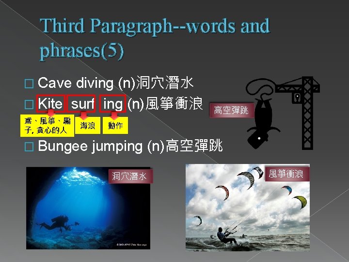 main ideas of the third paragraph � 3. Sports can make body produce adrenaline rush and let athlete do the impossible task. � 4. A lot of young people take up cave diving, kite surfing, or bungee jumping now.