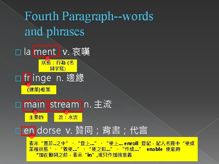 Third Paragraph--words and phrases(2) � Sub stance (n) 物質 a material or matter 之下、分支 � Fright 使(動詞 字尾) 恐怖 � Meta 美 causing fear terrible (狀態)令人~的 (形容詞字尾) bol ism (n) 新陳代謝 繼、之後 � Eu en ing (a) 令人恐懼的 狀況 the process by which the body produces energy phor ia (n) 幸福感(心情愉快) 疾病 a feeling of happiness or well-being