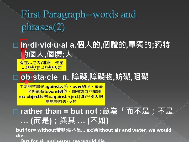 First Paragraph--words and phrases(1) adj. 險峻的, 陡峭的 steep·er, steep·est最高級 � Having a sharp inclination 急遽傾斜的角度 � el·e·ment n. 元素; 組成部分, 成分; 零件, 元件 � re·quire vt. 需要, 要求 vi. 要求, 命令 To demand � steep pref. Again; anew在一次;重新 � e·quip·ment n. 裝備, 設備品,