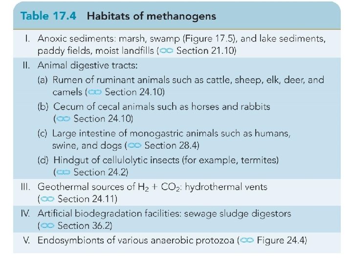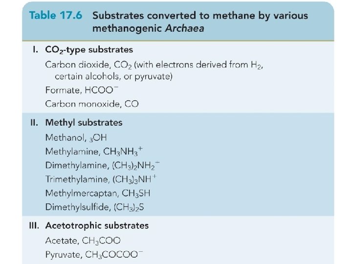 • Substrates for Methanogens – Obligate anaerobes – 11 substrates, divided into 3 classes, can be converted to CH 4 by pure cultures of methanogens • Other compounds (e. g. , glucose) can be converted to methane, but only in cooperative reactions between methanogens and other anaerobic bacteria