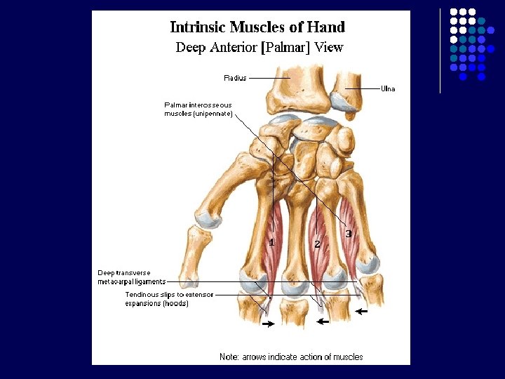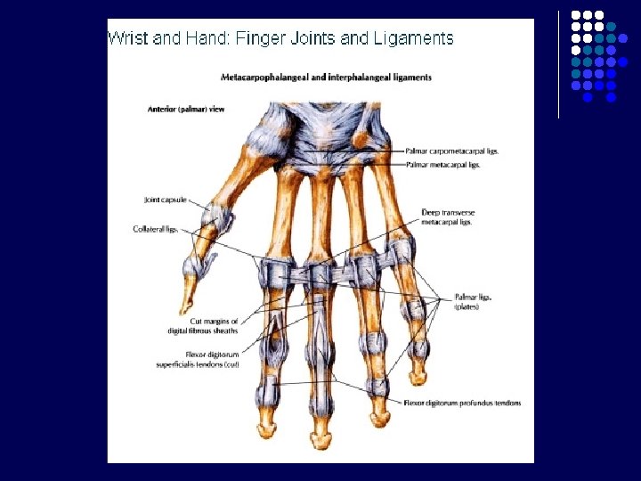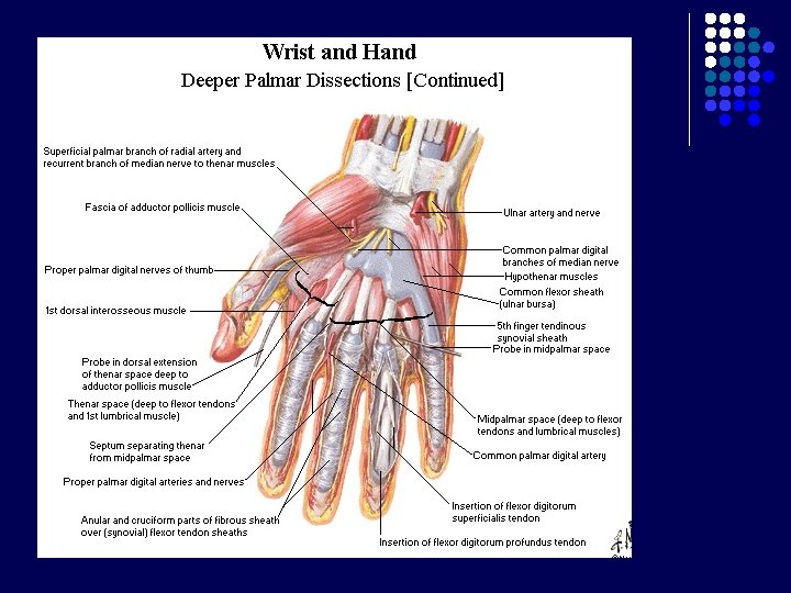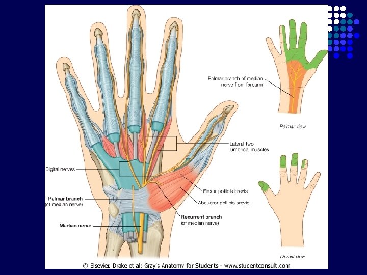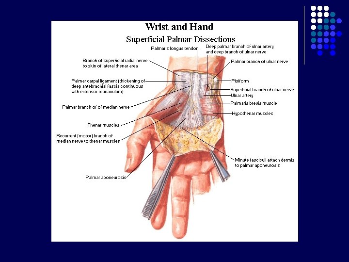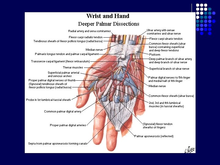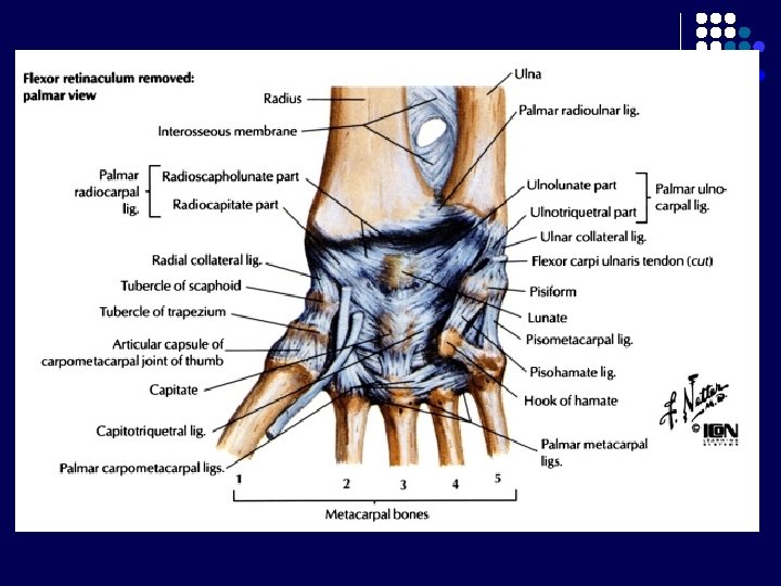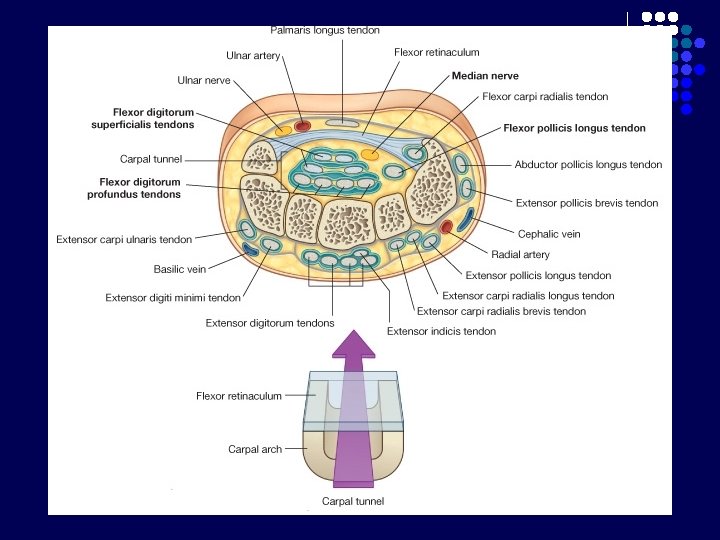 Carpal Tunnel l l Terbentuk krn adanya retinaculum flexorum Batas : - l Bagian posterior : 8 tulang carpalia Bagian anterior : Retinaculum flexorum : melekat di medial pada pisiform, di lateral naviculare dan trapezium Berisi : - nervus medianus 9 tendon dari 3 otot fleksor : m. flexor digitorum superficialis dan profundus (masing-masing 4 tendon), m. flexor pollicis longus
