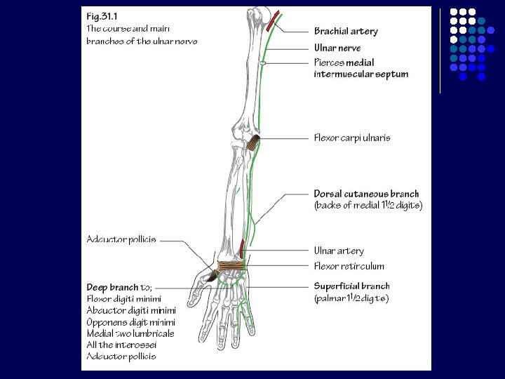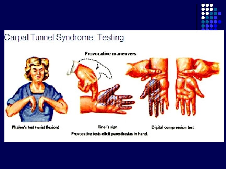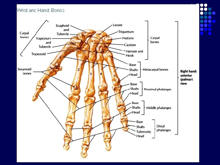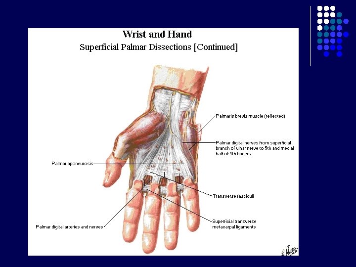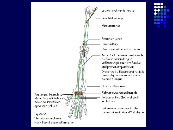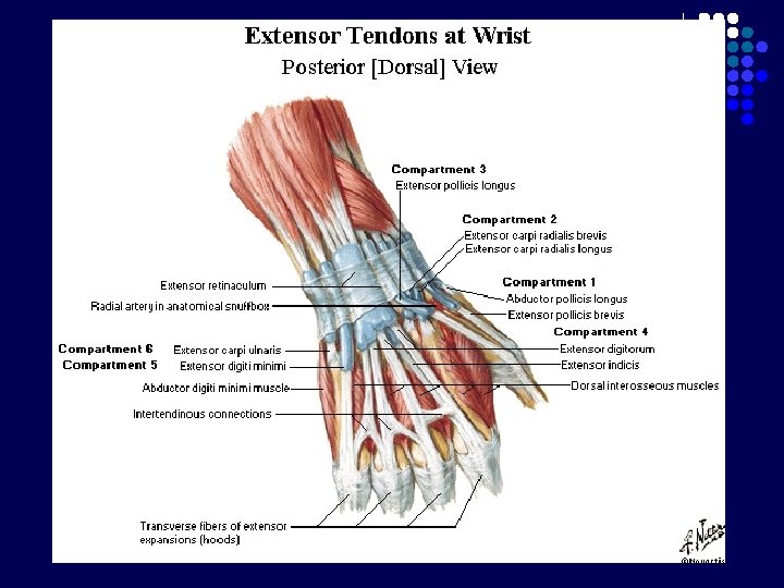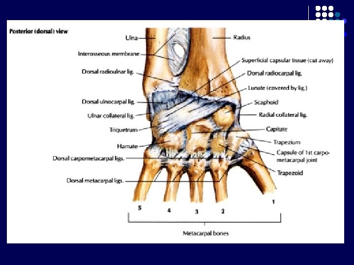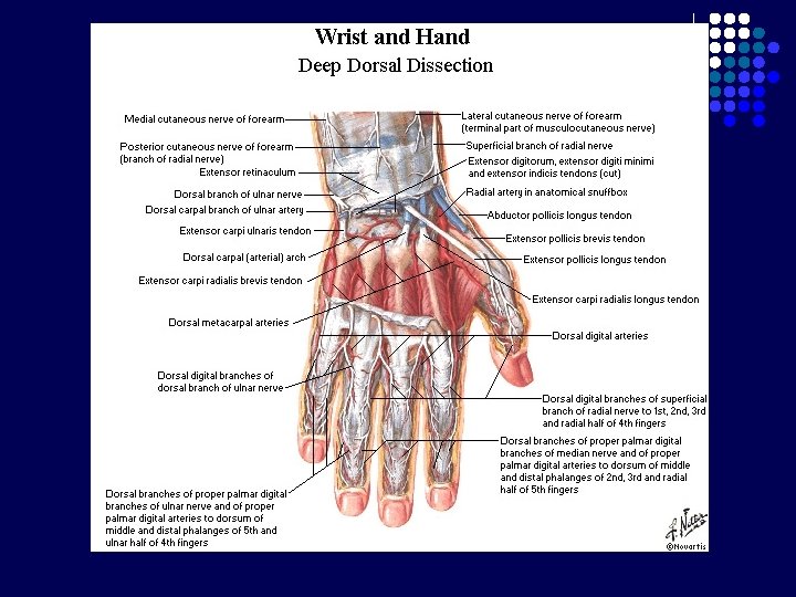 Carpal Tunnel l l Terbentuk krn adanya retinaculum flexorum Batas : - l Bagian posterior : 8 tulang carpalia Bagian anterior : Retinaculum flexorum : melekat di medial pada pisiform, di lateral naviculare dan trapezium Berisi : - nervus medianus 9 tendon dari 3 otot fleksor : m. flexor digitorum superficialis dan profundus (masing-masing 4 tendon), m. flexor pollicis longus