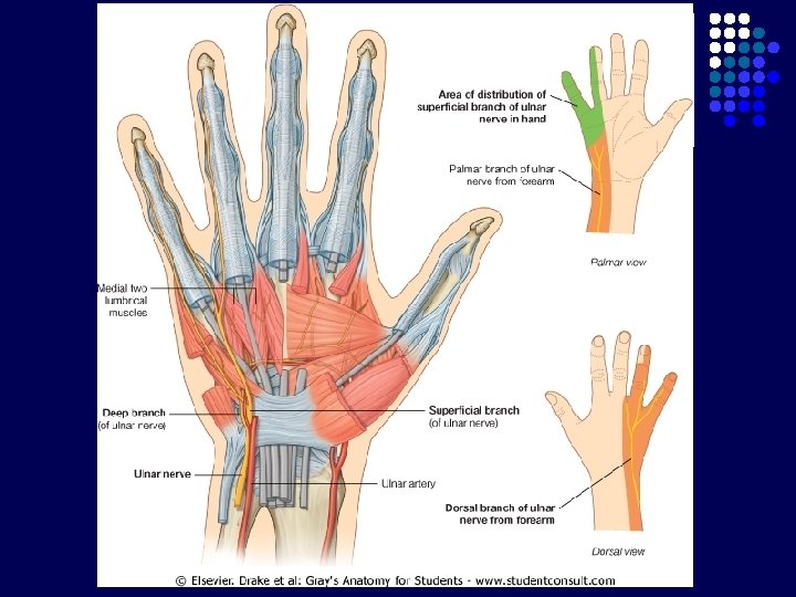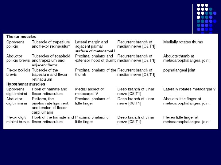 l Digiti V Otot Hypothenar l l Ulnaris Digiti I (Pollex) Otot Thenar l l l Semua berakhiran digiti minimi (Abductor, Flexor, Opponen) Abductor pollicis brevis Flexor pollicis brevis Opponens pollicis Adductor pollicis Medianus Ulnaris Otot Intrinsik lain l l Mm. Interossei (4 Palmaris + 3 Dorsalis ) Mm. Lumbricalis (1, 2, 3, 4) Ulnaris Medianus, Ulnaris