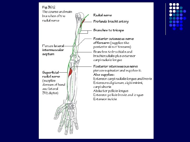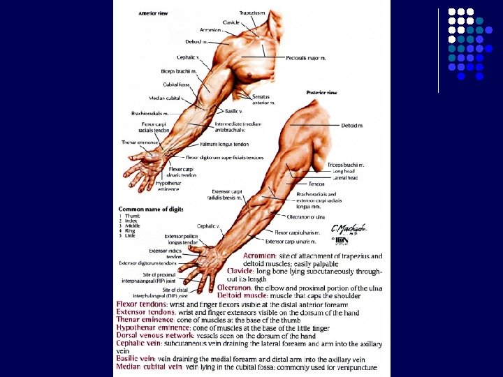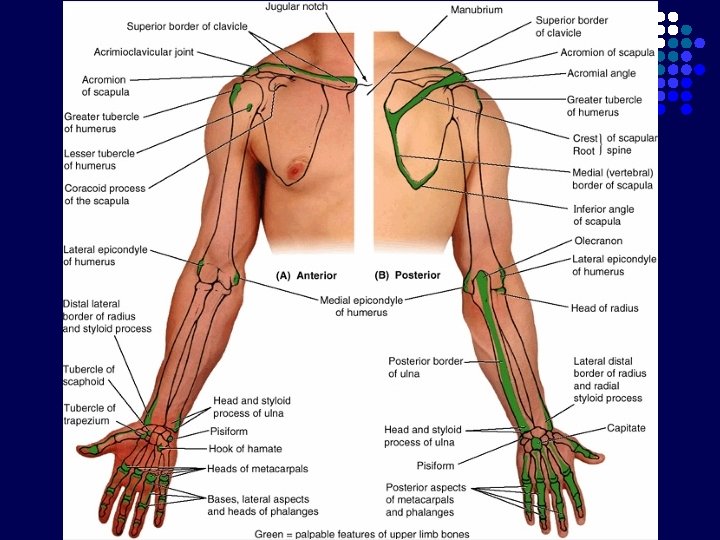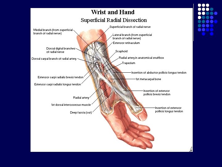 Tabatiere Anatomicum (Anatomical Snuffbox) Dibentuk oleh : l Tendon m. extensor pollicis longus (batas medial) l Tendon m. extensor pollicis brevis (batas lateral) l M. abductor pollicis longus (batas lateral) l Os scaphoid dan trapezium (dasar) Dilalui oleh : l A. radialis