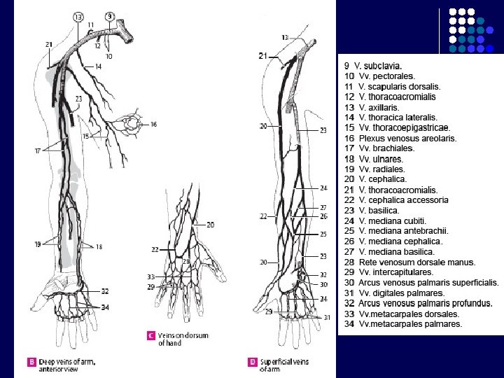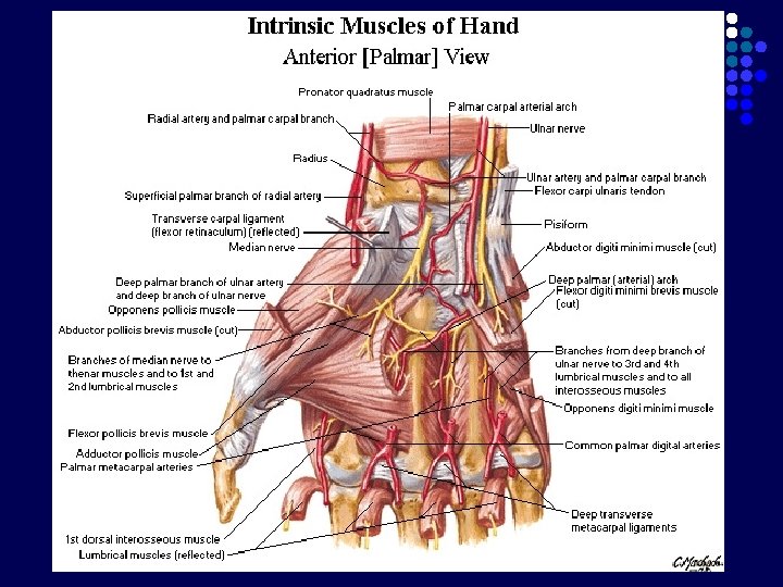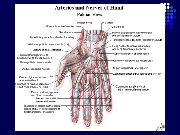 Dari a. radialis l Arcus palmaris profundus ke sup. anastomosis di regio carpalis ke inf. gabung dg Aa. Digitales dari arcus palmaris superficialis l l A Radialis indicis (lateral index) A princeps pollicis (lateral & medial pollex) Dari a. ulnaris l Arcus palmaris superficialis Aa. Digitales l R. Profundus a. ulnaris (bercabang di depan retinaculum flexorum)