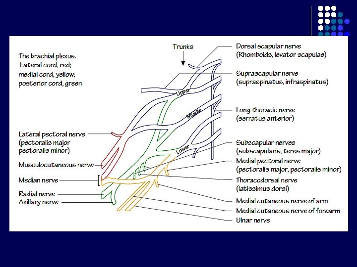 Cabang Lain Plexus Brachialis Cabang Supraclavicular l N. thoracalis longus (of Bell) (C 5, 6, 7): supply m. serratus anterior l N. suprascapular (C 5, 6): melalui incisura suprascapularis supply m. supra- & infraspinatus l N. scapularis dorsalis supply m. rhomboideus & levator scapulae l N. subclavius Cabang Infraclavicular l N. pectoralis medialis and lateralis supply m. pectoralis major & minor l N. cutaneous brachii & antebrachii medialis l N. thoracodorsalis (C 6, 7, 8) supply m. latissimus dorsi l N. subscapularis sup & inf supply m. subscapularis & m. teres major