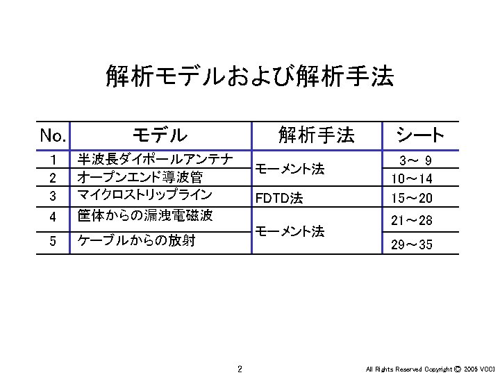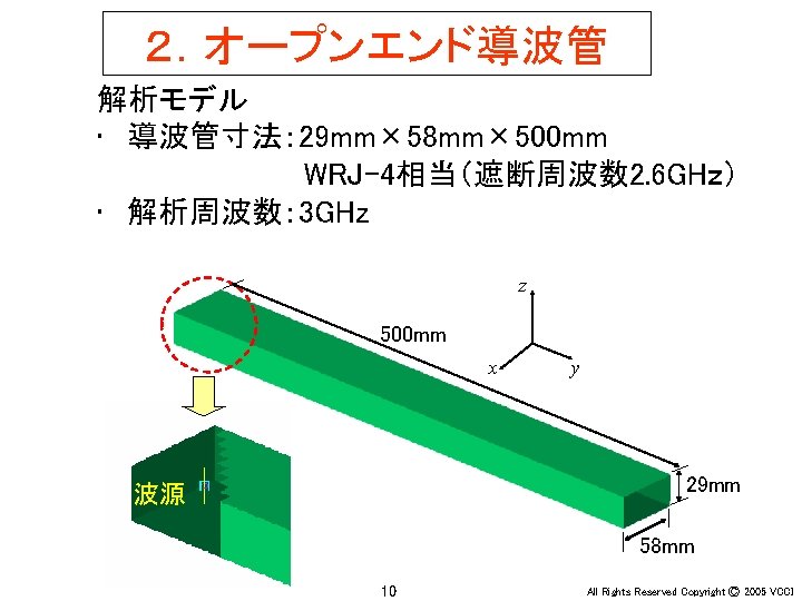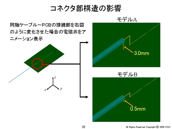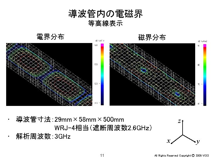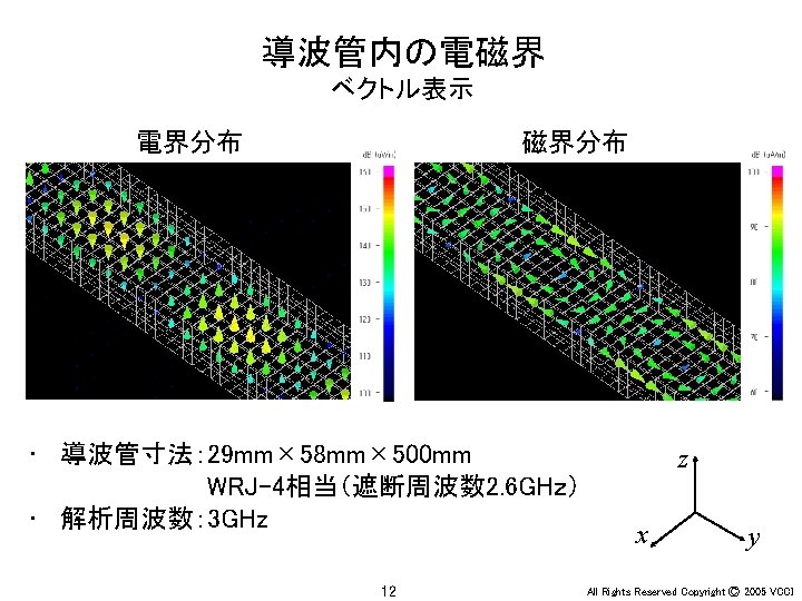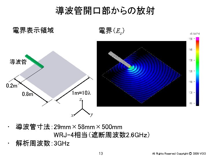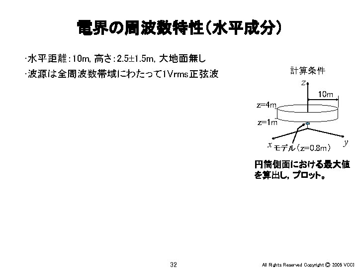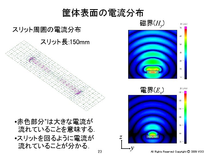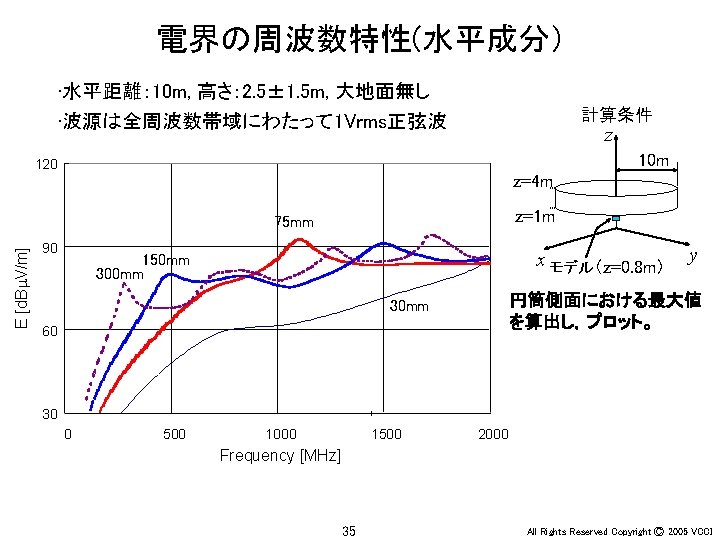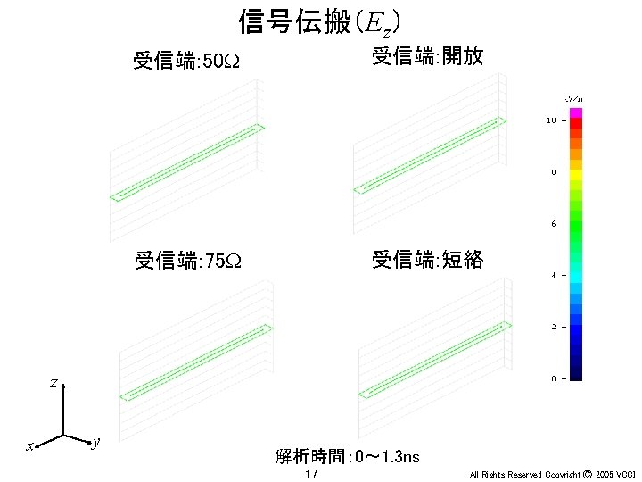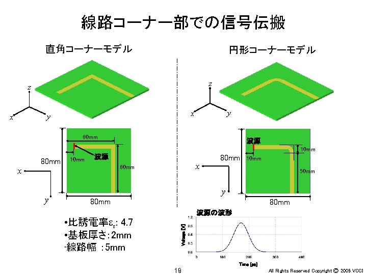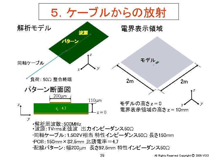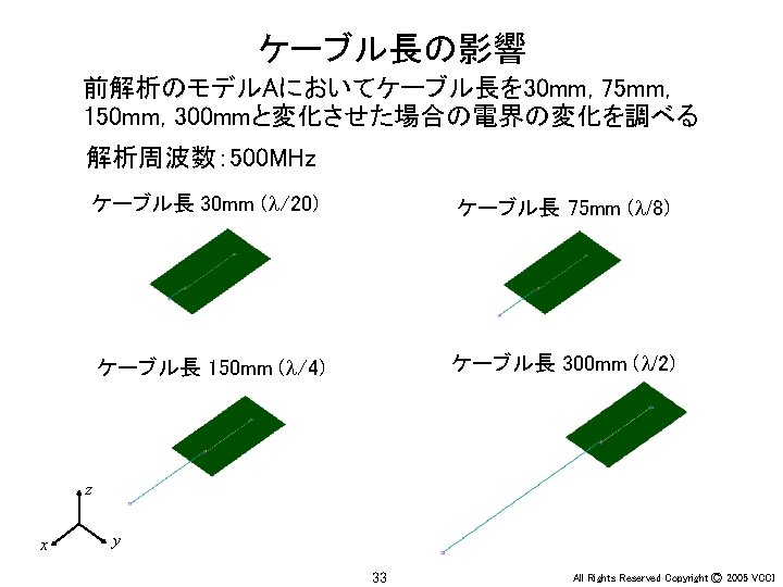 Ey 30 MHz xy 100 MHz 200 MHz Slides: 36 Download presentation アンテナ周辺の電界(Ey) 30 MHz x-y平面 100 MHz 200 MHz z 20 m y x x y 20 m 30 MHz x-z平面 100 MHz 200 MHz z z x y x 4 All Rights Reserved Copyright Ⓒ 2005 VCCI アンテナ周辺の電界(Ey) 大地面あり 30 MHz 水平ダイポール 100 MHz 200 MHz 大地面なし(自由空間) 100 MHz 30 MHz 20 m 20 m z z x x 6 y All Rights Reserved Copyright Ⓒ 2005 VCCI アンテナ周辺の電界(Ez) 大地面あり 30 MHz 垂直ダイポール 100 MHz 200 MHz 大地面なし(自由空間) 100 MHz 30 MHz 20 m 20 m z z x x 8 y All Rights Reserved Copyright Ⓒ 2005 VCCI 信号伝搬(Ez) 直角コーナーモデル 円形コーナーモデル z x 20 y All Rights Reserved Copyright Ⓒ 2005 VCCI 漏洩電磁界(Hy) 200 mm (2 l/3) 150 mm (l/2) 75 mm (l/4) 37. 5 mm (l/8) z y 22 All Rights Reserved Copyright Ⓒ 2005 VCCI 磁界(Hy) 漏洩電磁界 筐体表面の電流分布 z y 電界(Ex) z x 26 y All Rights Reserved Copyright Ⓒ 2005 VCCI 磁界(Hy) 漏洩電磁界 筐体表面の電流分布 z y 電界(Ex) z x 28 y All Rights Reserved Copyright Ⓒ 2005 VCCI PCB周囲の電界(Ex) モデルA モデルB y x 31 All Rights Reserved Copyright Ⓒ 2005 VCCI PCB周囲の電界(Ex) 30 mm (l/20) 75 mm (l/8) 150 mm (l/4) 300 mm (l/2) y x 34 All Rights Reserved Copyright Ⓒ 2005 VCCI