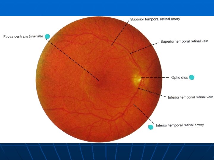 4 - Ophthalmoscopic Exam n n n Adjust proper settings on scope (light intensity, light shape, light color, focus) Position patient and adjust ambient lighting Start laterally from a distance and obtain red reflex, then approach steadily as if peering through a keyhole If lots of glare, use a smaller diameter light setting Find optic disc directly or by following a blood vessel from narrower aspect to wider aspect, which will lead you to the optic disc