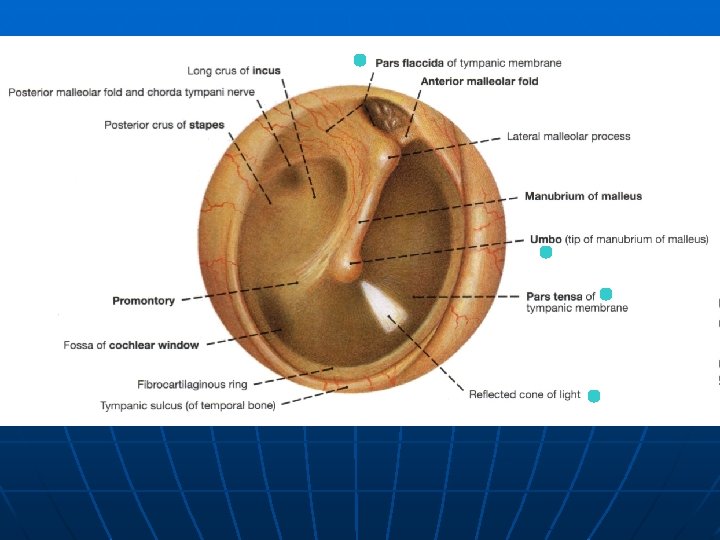 Examination of TM n n The TM is clear (transparent) when light passes through the membrane The TM is dull (opaque) when light does not pass through the membrane so that the bony landmarks can not be clearly seen