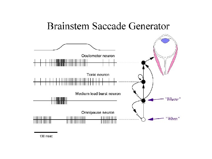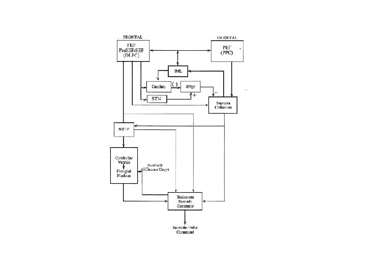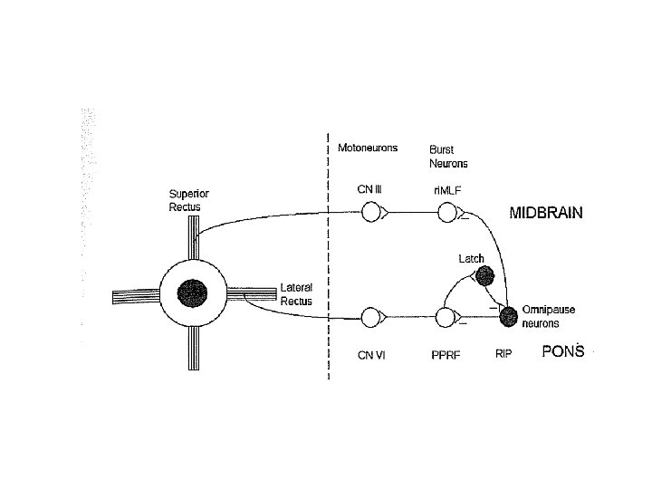 Brainstem saccadic control • Paramedian pontine reticular formation (PPRF) – – – Burst and omnipause neurons Aim to reduce horizontal motor error Project to directly to lateral rectus motor neurons Projects indirectly to contralateral medial rectus Medial longitudinal fasciculus • Mesencephalic reticular formation – Also influenced by omnipause neurons – Vertical motor error – Projects to superior and inferior rectus motor neurons