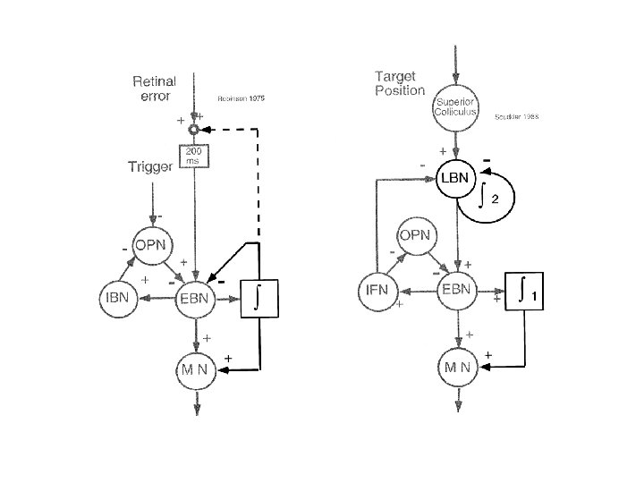 Smooth pursuit • Track movement on part of retina • Two theories – Motor (Robinson) • Retinal slip only provides velocity • Does not capture pursuit onset – Sensory (Lisberger and Krauzlis) • Position, velocity and acceleration