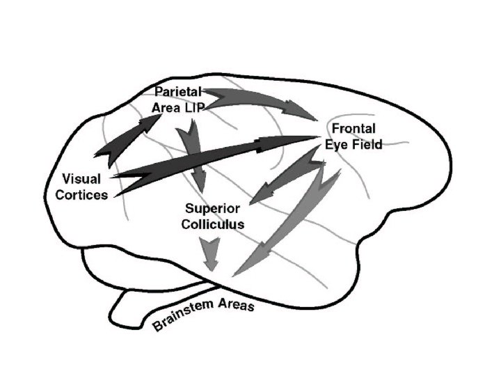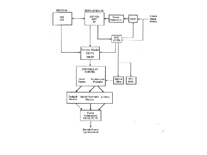 Smooth pursuit cortex • Visual motion areas MT and MST – Active in visual processing for pursuit – Stimulation influences pursuit speed – Projects to DLPN and FEF – Does not initiate pursuit • Frontal eye fields – Stimulation initiates pursuit – Lesions diminish pursuit