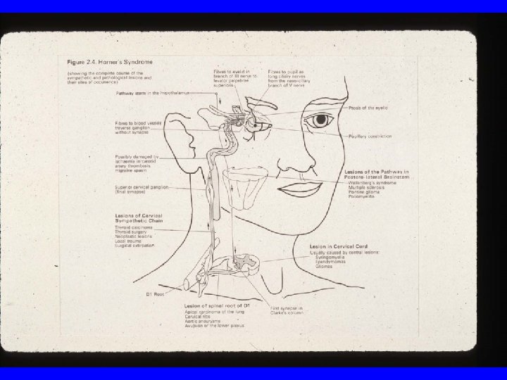 Findings • Ptosis – upper eyelid ptosis – inverse ptosis – narrowing of the palpebral fissure • facial anhidrosis • miosis – > 1. 0 mm – dilatation lag • any combination of the above – van der Wiel HL The diagnosis of Horner’s syndrome. Clin Neurol Neurosurg. 1988; 90: 103 -108.