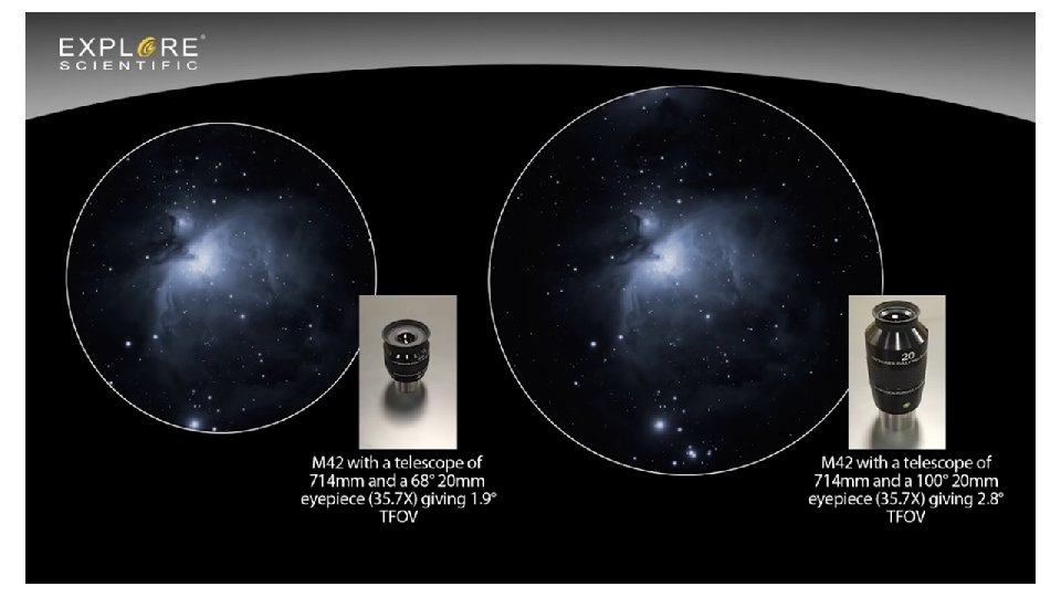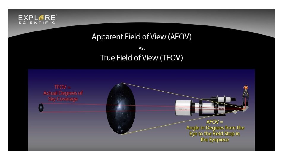 Field of View • AFOV = Apparent Field of View • TFOV = True Field of View • Eyepieces are specified in AFOV. • More AFOV produces more TFOV. • More AFOV gives you the effect of looking through a wide picture window.