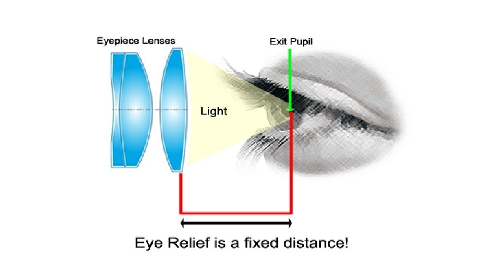 Eye Relief • Distance from the eyepieces rear most piece of glass to eye for optimum viewing. • Higher magnification normally means lower or less eye relief. • Longer eye relief means more comfort in viewing. • With eye relief of 17 mm or more, the observer can wear glasses while observing.