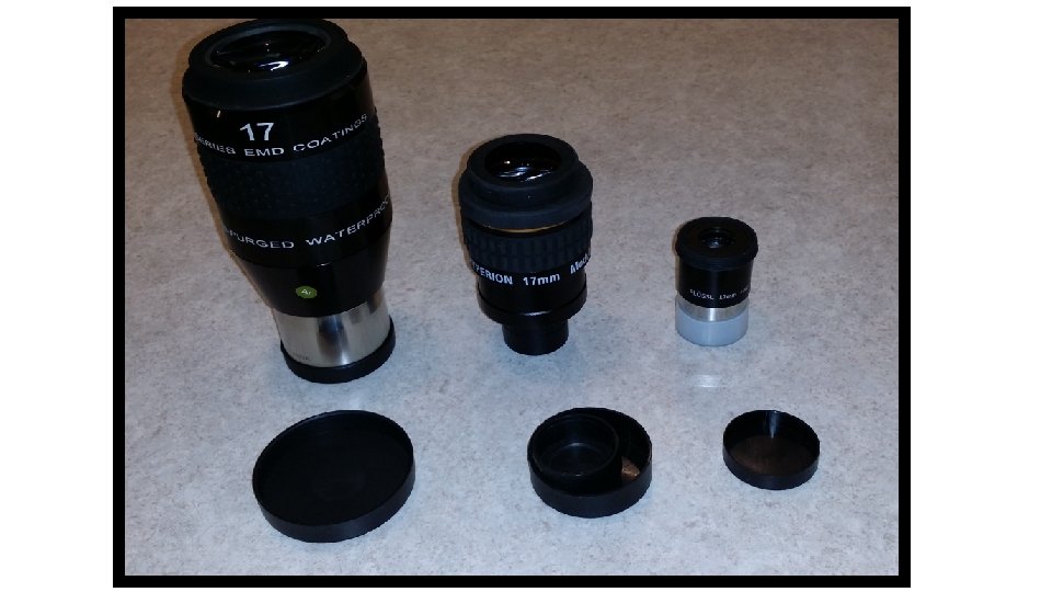 Eyepiece Diameter • 0. 96 inches (department store or toy telescopes) • 1. 25 inches • 2 inches • 3 inches (professional or research grade) • With an eyepiece fl below 14 mm a 2” provides little or no benefit. • With an eyepiece fl 14 mm and above, 1. 25” eyepiece may be losing some available light. • It depends on the AFOV of the eyepiece.
