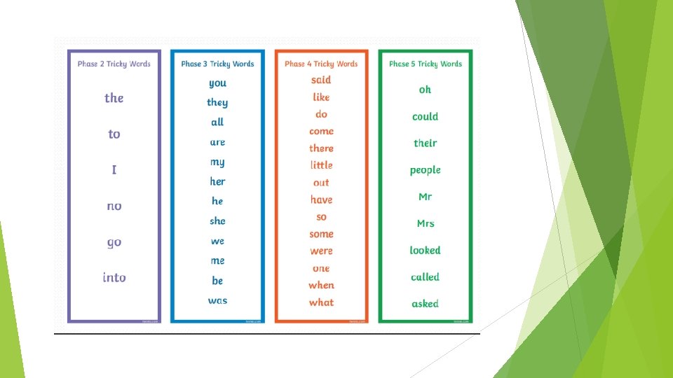 How you can help Read with your child at home as much as possible looking at segmenting and blending words and also spotting any tricky words. There are some flashcards for each phase for you to take home and these are great to use for a quick recap.