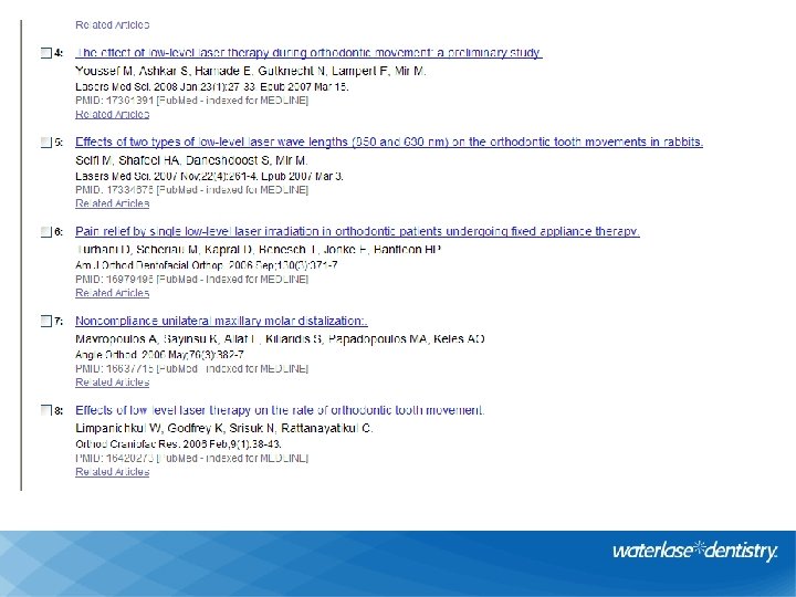 Background • For endothelium, there is increased granulation tissue and relaxation of vascular smooth muscle • For neural tissue we have reduced synthesis of inflammatory mediators, and axonal growth with maturation and regeneration • The above listed effects are a function of various wavelengths, dosage and method of application among other parameters such as pulse characteristics, distance to tissue, speed of movement. • Recent LLLT clinical research in dentistry covers applications from movement of teeth to accelerate orthodontic treatment to bone regeneration