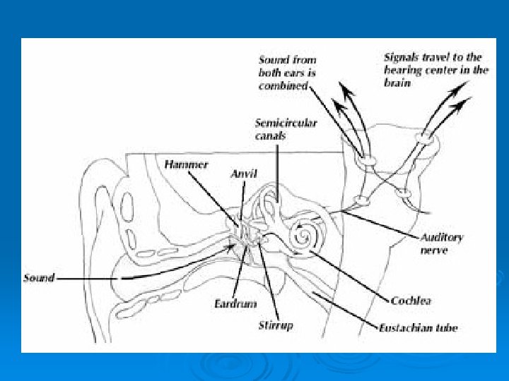 d. Hearing • sound waves push against eardrum • vibrations are passed on to three bones (hammer, anvil, and stirrup) and these bones in a lever system amplify vibrations • oval window is pushed inward by vibrations • round window pushes out to let vibrations out • the movement of the oval window creates pressure waves in the fluid of the cochlea l The pressure waves make the basillar membrane move up and down l The stereocillia of the hair cells bend against the tectorial membrane l The hair cells synapse with the neve fibres of the auditory nerve • signal is sent to the brain via the auditory nerve (auditory nerve brain stem thalamus temporal lobe) • http: //www. youtube. com/watch? v=v. Ti. Gskc 1 o 48 • (hearing and balance)