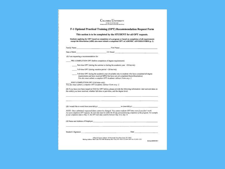 Application Process • Come to the ISSO with the following documents: • Print out of electronic I-94 information / white I-94 card Passport All I-20 s Completed I-765 Completed OPT Request Form and form from school advisor • Trainee Administrative Fee -$100 by cash or credit card • online-https: //lexington. columbia. edu/isso/trainee • •