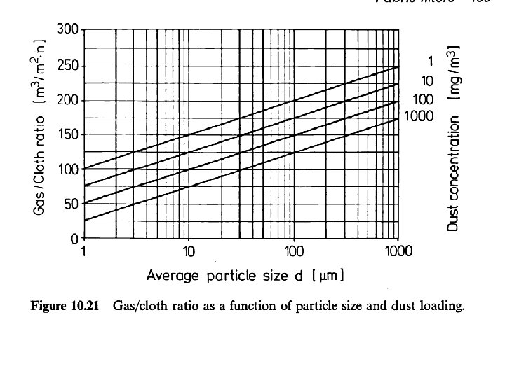 Details • For a dust concentration of 1818 and mean particle size of 15 microns the gas/cloth ratio is 70 m/h with a face velocity of 1. 2 m/min. • This yields the area of the filter to be 12 m 2